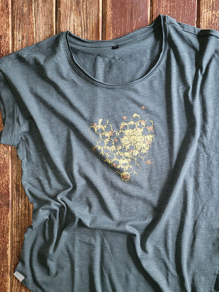 ar mani kā ar bitēm uz stilīga, pagarināta piegriezuma sieviešu t-krekla. t-kreklam ir garāka aizmugures daļa un siluetu pagarinoša noapaļota apakšmala. roku darba sietspiedes apdruka, kurai...