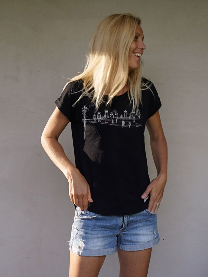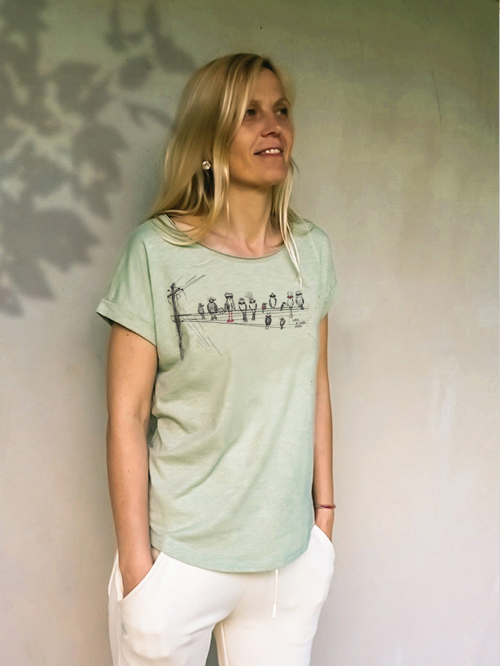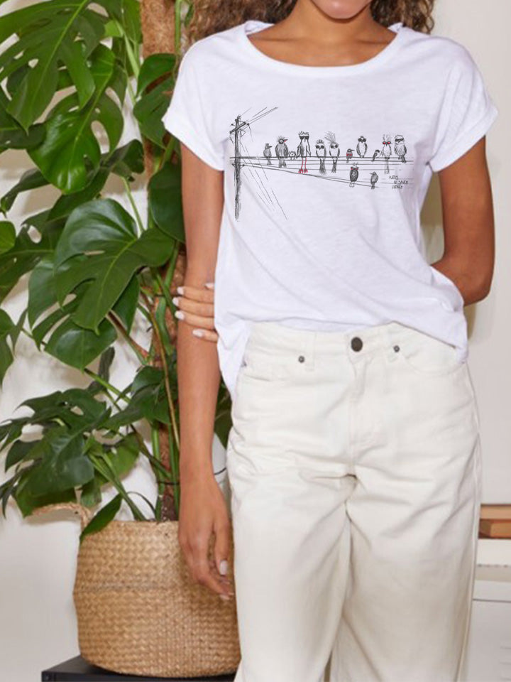 katrs ar saviem putniem uz stilīga sieviešu t-krekla. t-kreklam ir garāka aizmugures daļa un siluetu pagarinoša noapaļota apakšmala. roku darba sietspiedes apdruka, kurai izmantojam mazāk kaitīgas, bet...
