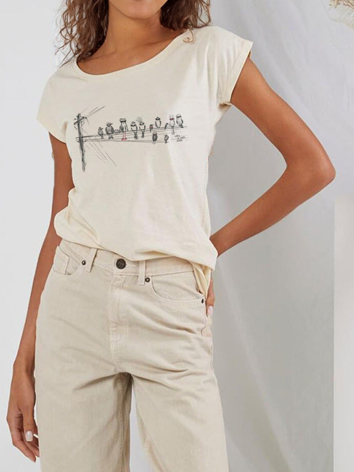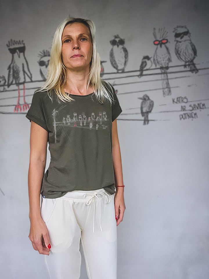 "katrs ar saviem putniem" uz pagarināta t-krekla