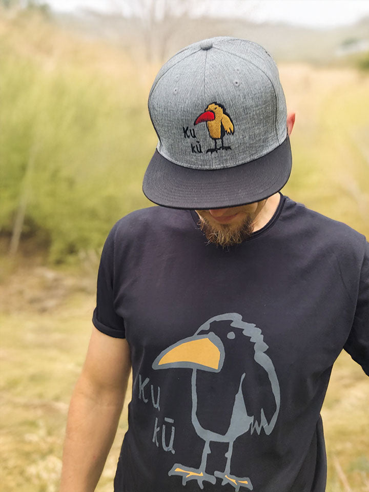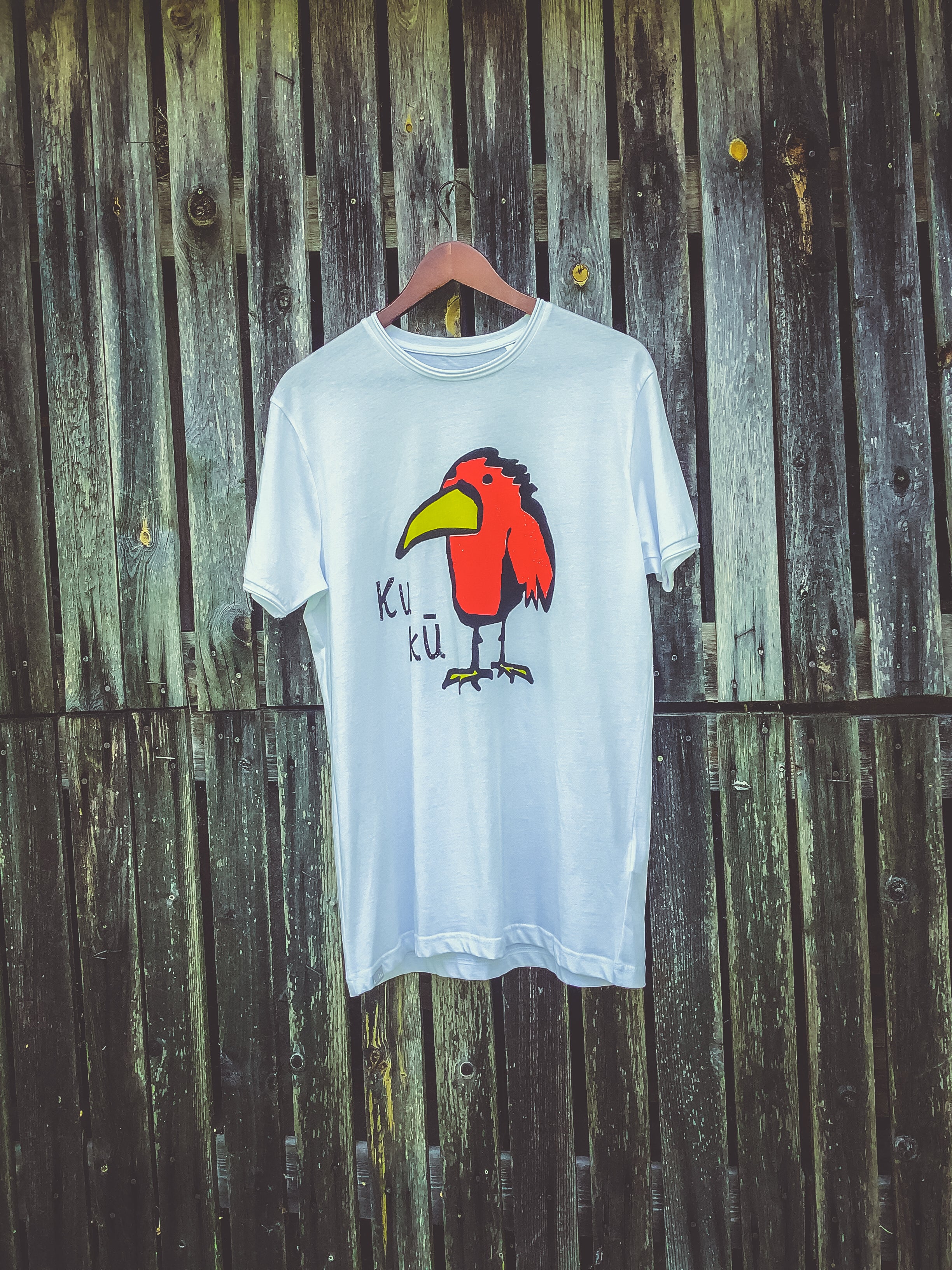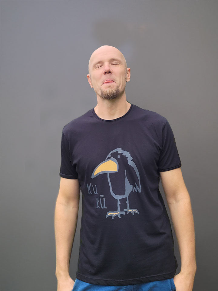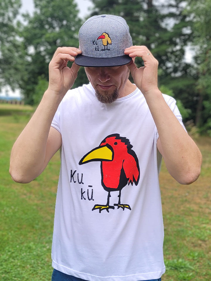 k u - k ū uz Roll vīriešu t-krekla no plāna, viegla organiskās kokvilnas auduma ar dekoratīvu "rullīša" maliņu gar apkakli un piedurknēm. roku darba sietspiedes apdruka,...