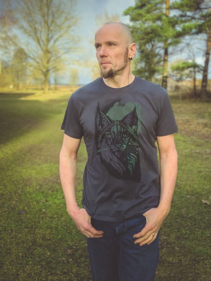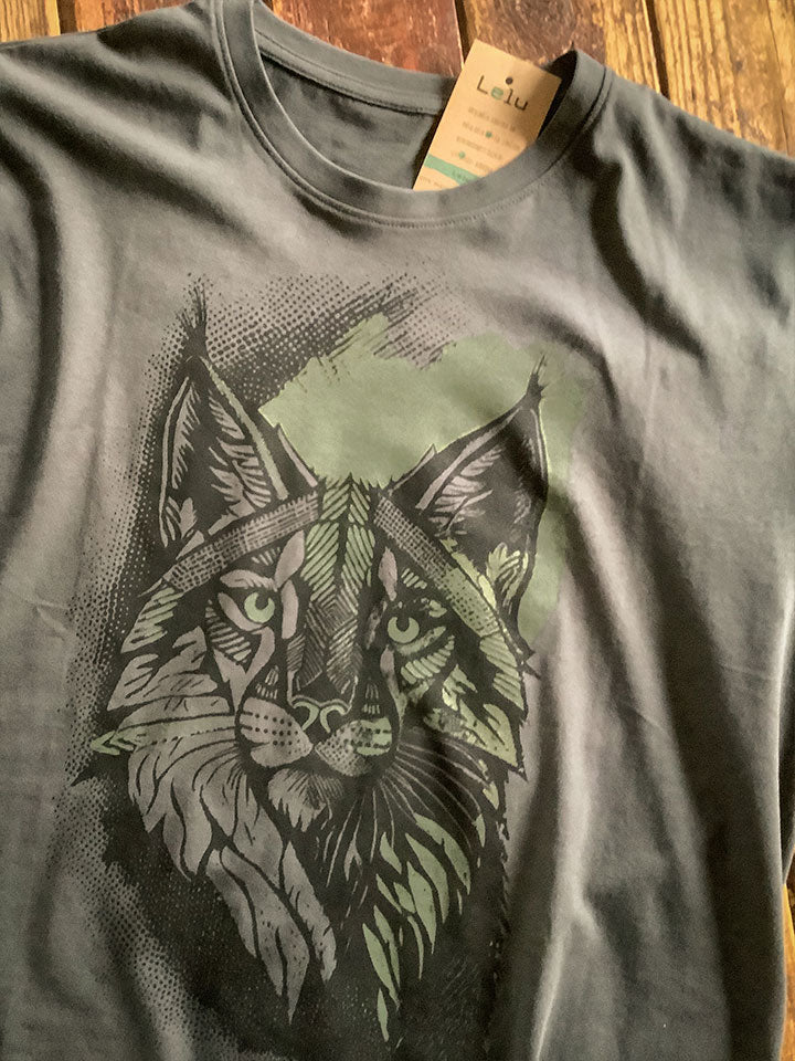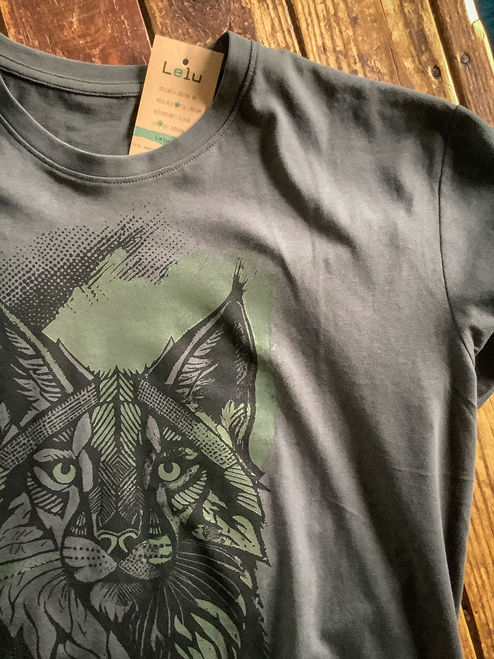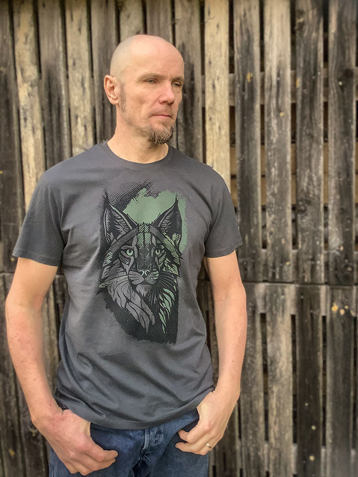 grafisks lūsis uz vīriešu t-krekla no labas kvalitātes organiskās kokvilnas auduma. roku darba sietspiedes apdruka, kurai izmantojam mazāk kaitīgas, bet noturīgas krāsas. ieteicamā mazgāšanas temperatūra ir 30°,...