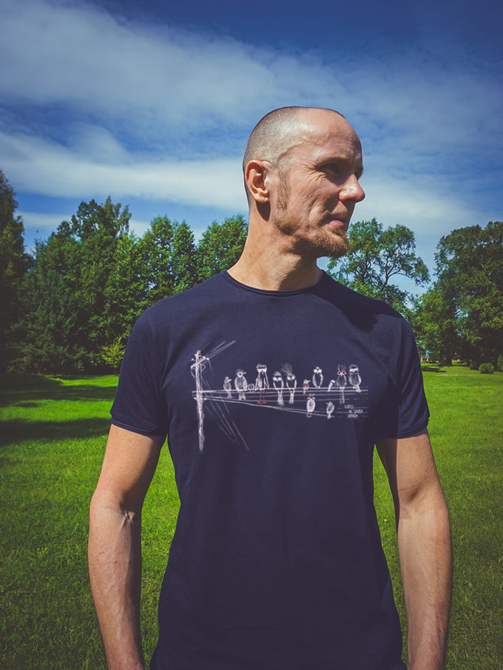 katrs ar saviem putniem uz vīriešu t-krekla no plāna, viegla organiskās kokvilnas auduma ar dekoratīvu "rullīša" maliņu gar apkakli un piedurknēm. roku darba sietspiedes apdruka, kurai izmantojam mazāk...